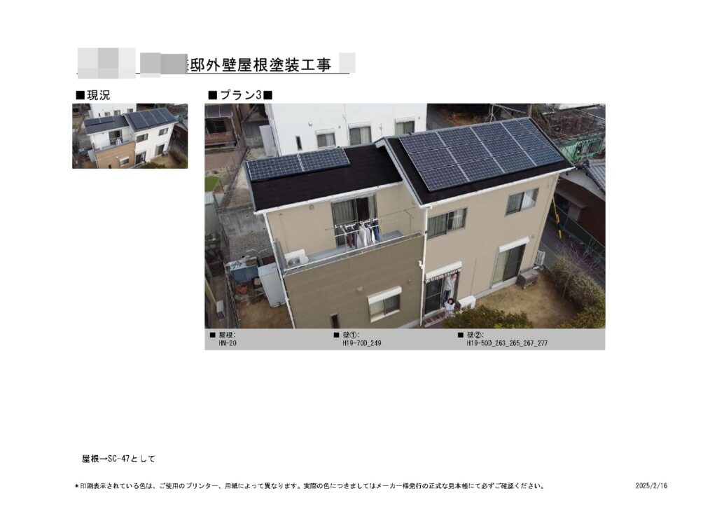 ご提案としましては、外壁は断熱・遮熱・防音・消臭効果のあるガイナという塗料をご提案させていただきます。こちらの塗料は、JAXA公認塗料で、特殊セラミックが塗膜を保護し、外壁材の熱による膨張・収縮を抑制することで、建材の劣化を防いでくれます。屋根に関しましては、お客様より美観性、耐候性に優れた塗料のご提案を希望されておりましたので、高耐久性と美観性の優れた無機エクスカリバーでご提案させて頂きました。こちらの塗料は公表されている無機含有率の高さで、高耐久性は勿論の事、美観性も維持してくれる塗料となります。また弊社一押しのモルドバスター2000を塗料の中に撹拌させることでカビやコケを寄せにくくする防菌材と、美観性を底上げしてくれる仕上げ材として、弊社の取り扱っているクリスタルシーズンtgという光触媒コーティングのご提案もさせて頂きました。こちらは塗料仕上げ剤として最後の工程に外壁や付帯部、などお家全体に吹付けるコーティング材となります。