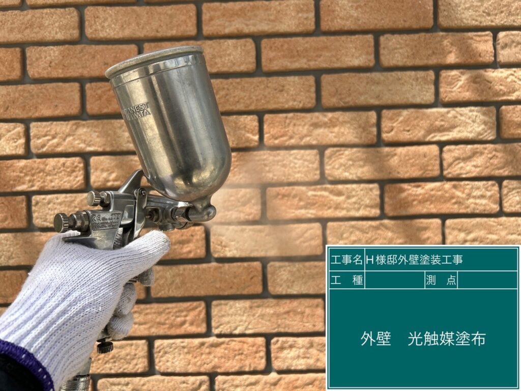 壁に仕上げ材の光触媒プロテクトコーティング(クリスタルシーズンtg)を塗布します。