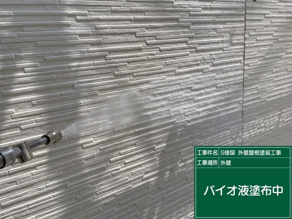 外壁に仕上げ材の光触媒プロテクトコーティング(クリスタルシーズンtg)を塗布します。